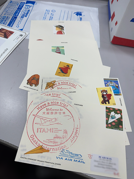 宛先は小さなシールに印字しておき、出発前にカードに貼り付けました。そして、大阪の空港に到着した際に、カードに空港のスタンプを押しました。…うまくいきませんでした!(ですが、通天閣のスタンプもあまり状態が良いとは言えなかったので、先に空港でスタンプを押しておいてよかったです。←国内の旅先から海外の方にカードを出す際は、「絶対に書く時間なんかとれない」ので、道の駅や空港などでスタンプを押して、空いているところにほんのちょっとだけメッセージを書いています。特に東アジア、中華圏の方はこの手のスタンプが大好きな人が多いので、おすすめですよ☺) 大阪で泊まったホテルで スタンプの周りに一言だけ添え、junaidaさんの切手を貼って 初日印で引き受けをお願いしました。